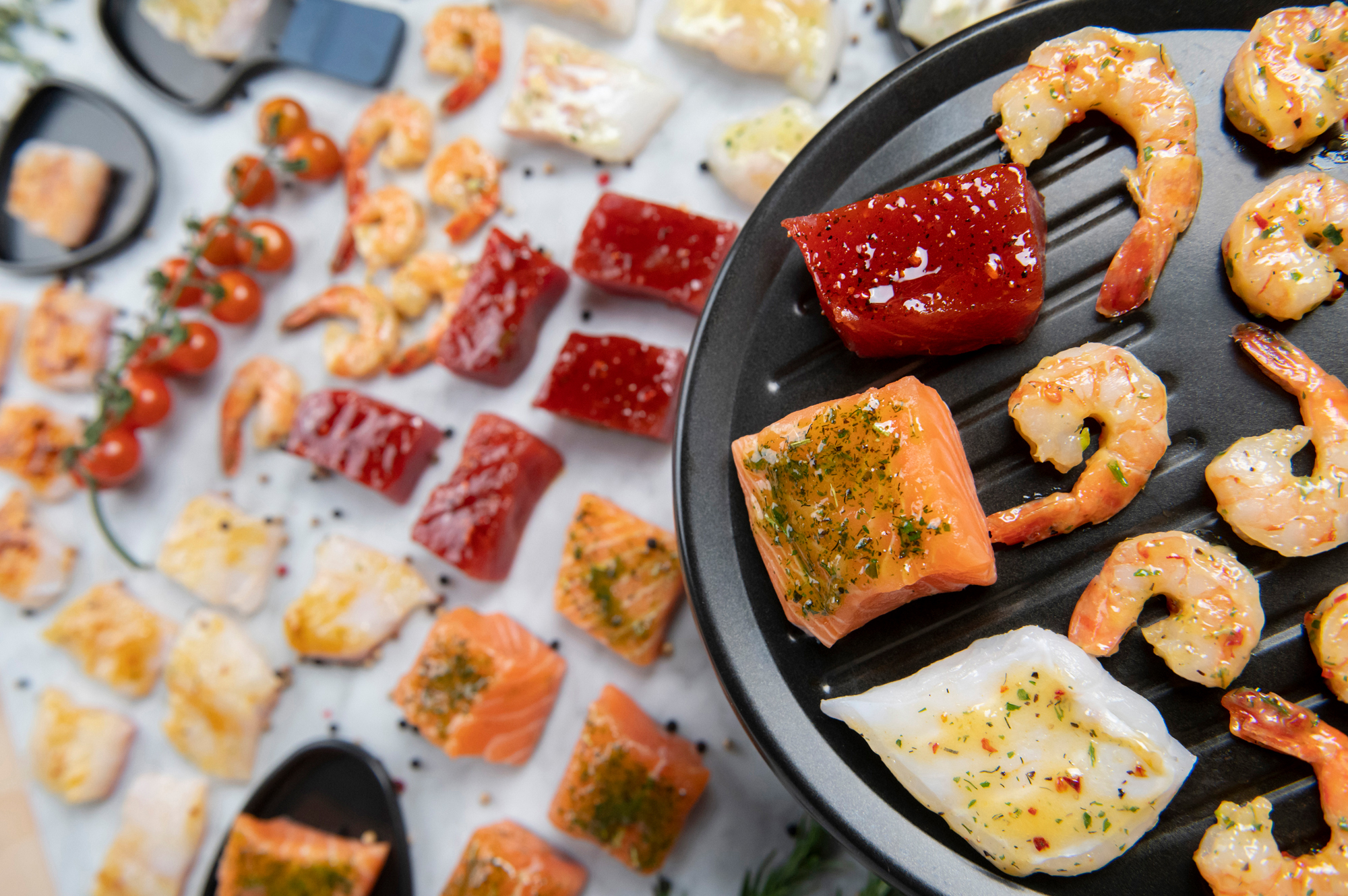 Een verfijnde selectie van gegrilde tonijn, gerookte wilde zalmfilet en Hollandse garnalen. Klein van formaat, groots van smaak.