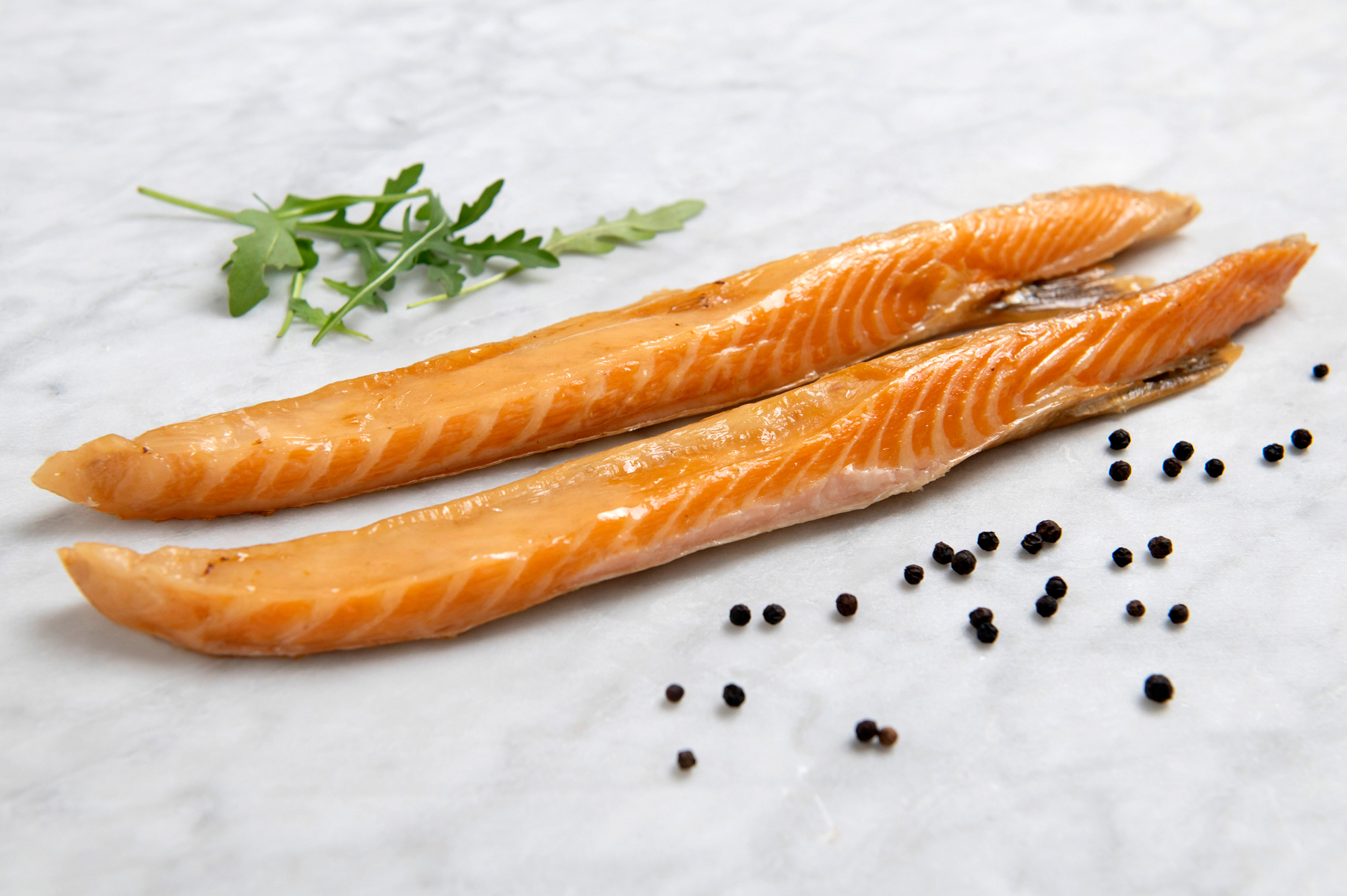 Het buikje van de zalm op ambachtelijke wijze gerookt, lekker voor zo uit het vuistje maar ook heerlijk in salades of op brood.