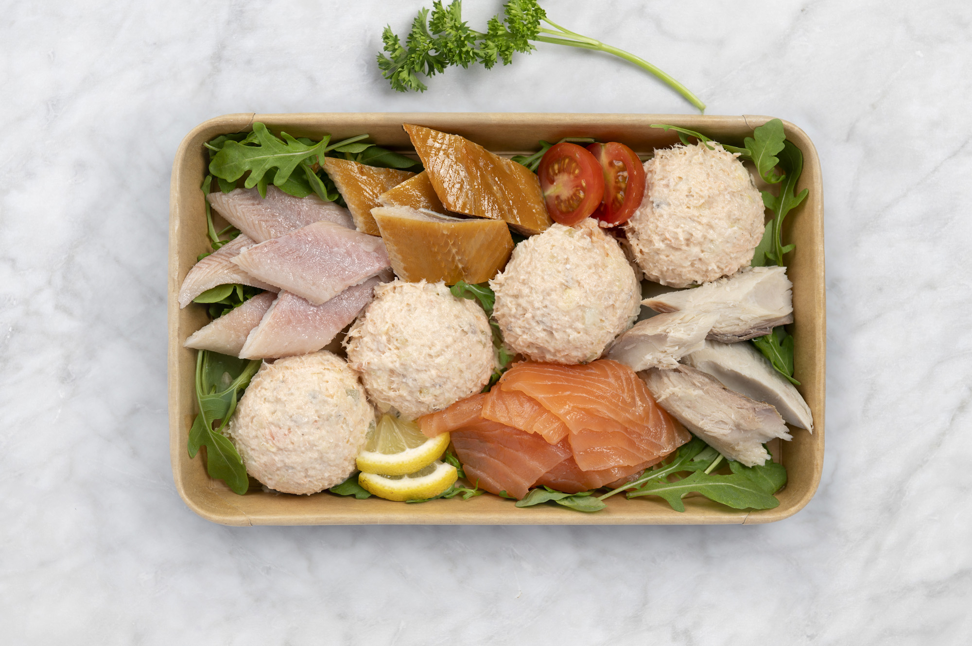 Paling (VIS), zout, rook. Zalm (VIS), zout, basterdsuiker, rook. Makreel (VIS), zout, rook. Haring (VIS), zout, rook. Zalmsalade ( (Zalm, appel, ui, augurk, Salade (Aardappel, raapolie, water, augurk, ui, SCHARRELEI, WORTEL, azijn, kruiden en specerijen (bevat: MOSTERD, GLUTEN, KORIANDER), MAIS, zout suiker, zetmeel (MAIS), AROMA (bevat TARWE, SOJA, MELK, LACTOSE, KIP), voedingszuur (E330), gehydrolyseerd plantaardig EIWIT, (SOJA, TARWE, MAIS), verdikkingsmiddel (guargom, E415), antioxidant (E385), stabillisator (E451), glucosestroop, maltodextrine, dextrose, kleurstof (E101, bietenrood, beta-caroteen) zoetstof (E954iv). Saus (water, 20% plantaardige olie (raapolie), gemodificeerd maiszetmeel, glucose-fructosestroop, SCHARRELEI, gemodificeerd zetmeel, zout, voedingszuren: azijnzuur, citroenzuur, verdikkingsmiddel, guarpitmeel, conserveermiddel: kaliumsorbaat, zoetstof: sacharinen, antioxidant: caliumdinatriumethyleen-diaminetetraacetaat (caliumdinatrium-EDTA).)